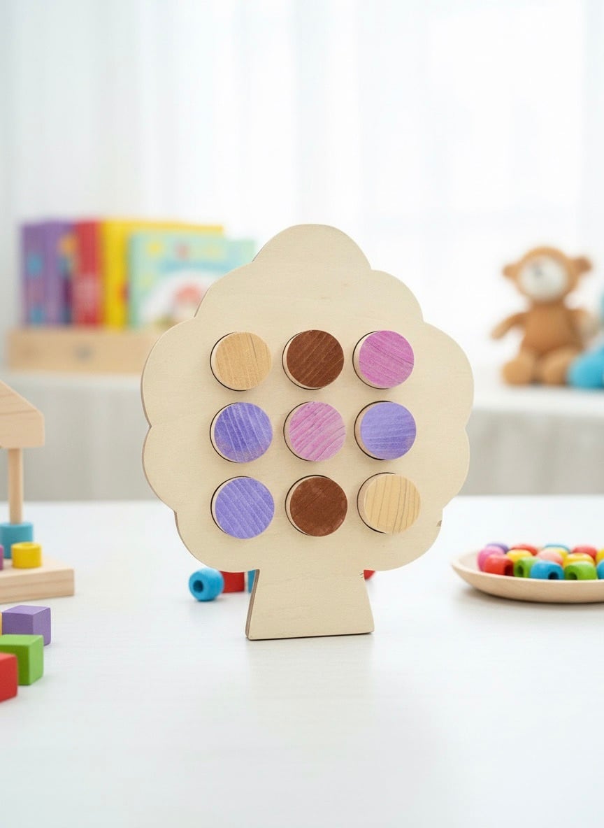 「実のなる木」は、遊びの中で子どもたちの育つ力を引き出したいという想いから生まれた、木製の発達支援教材です。