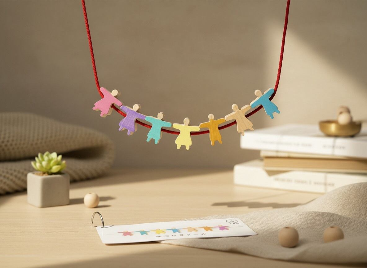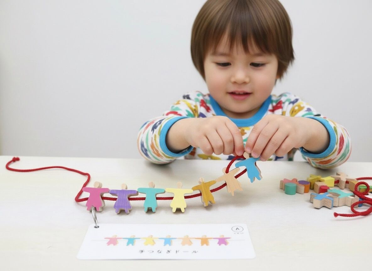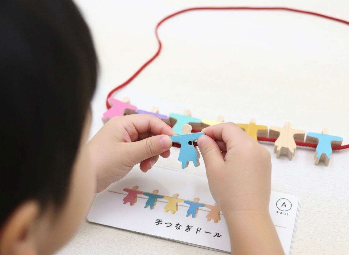 ピースをひもに通して人形をつなげていく遊びを通して、