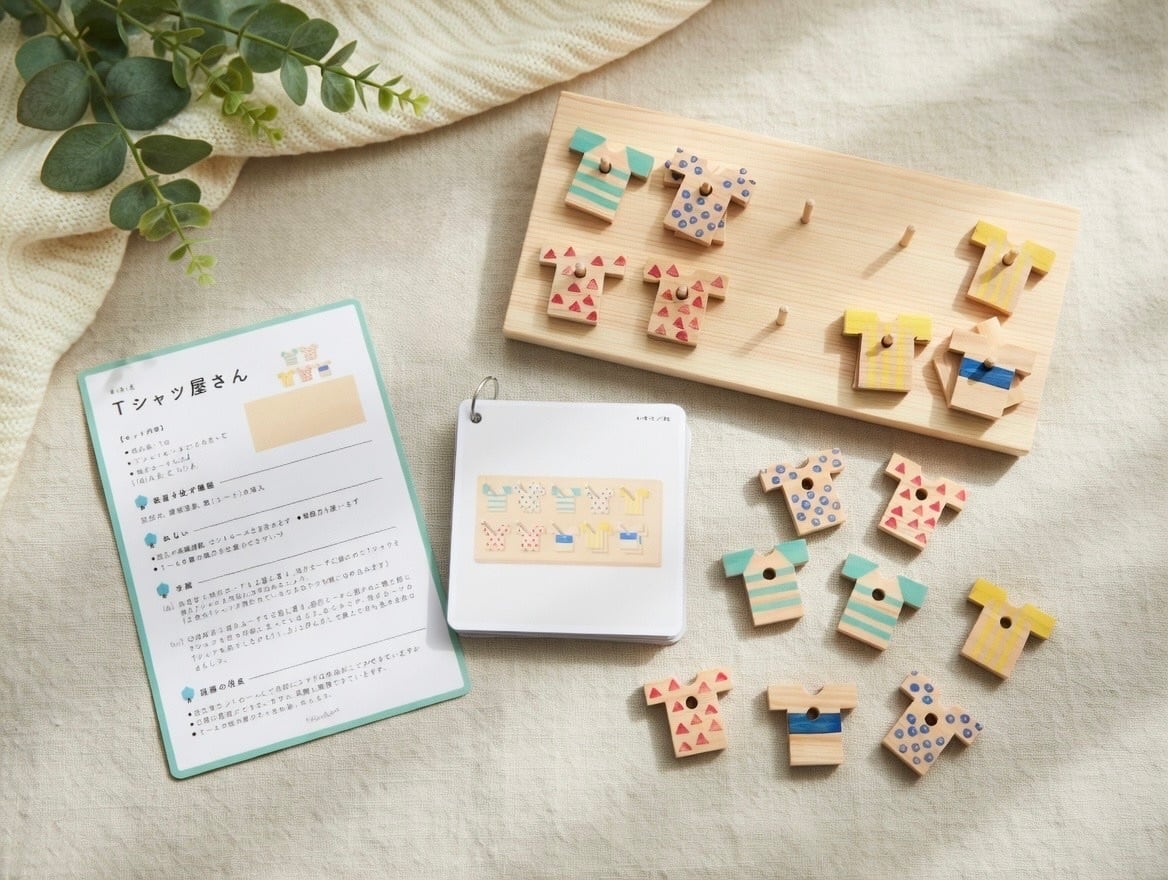 「Tシャツ屋さん」は、突起台にTシャツのコマをはめて順序通りに並べることで、指先の操作力や認知力、数の概念に自然と触れられる教材です。