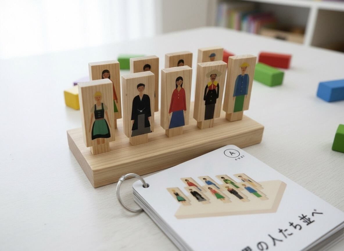 言葉や視覚的な情報を手がかりに、人物の特徴や違いに目を向けながら、位置関係を読み取り、考えて取り組む経験を大切にしたいという想いから生まれた、木製の発達支援教材です。