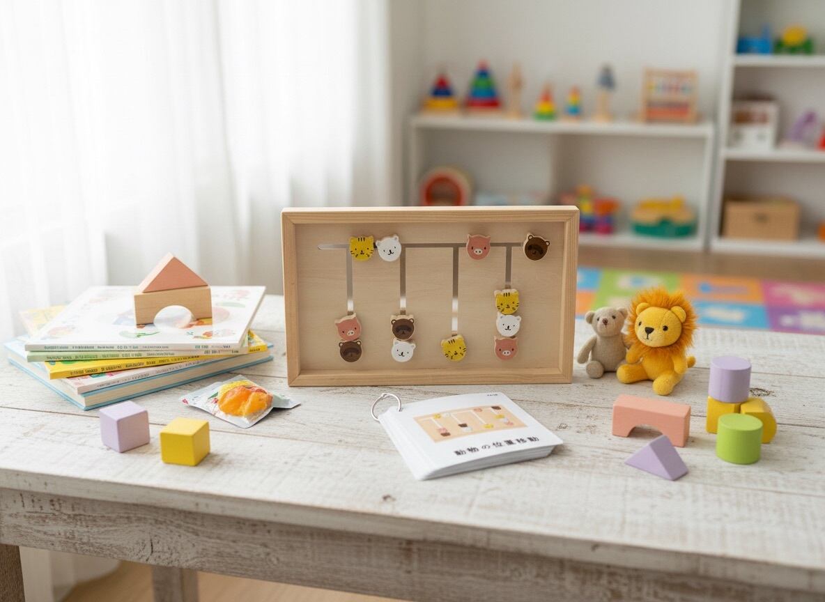 「動物の位置移動」は、手順や行動の意味を考えながら取り組む経験を大切にしたいという想いから生まれた、木製の発達支援教材です。