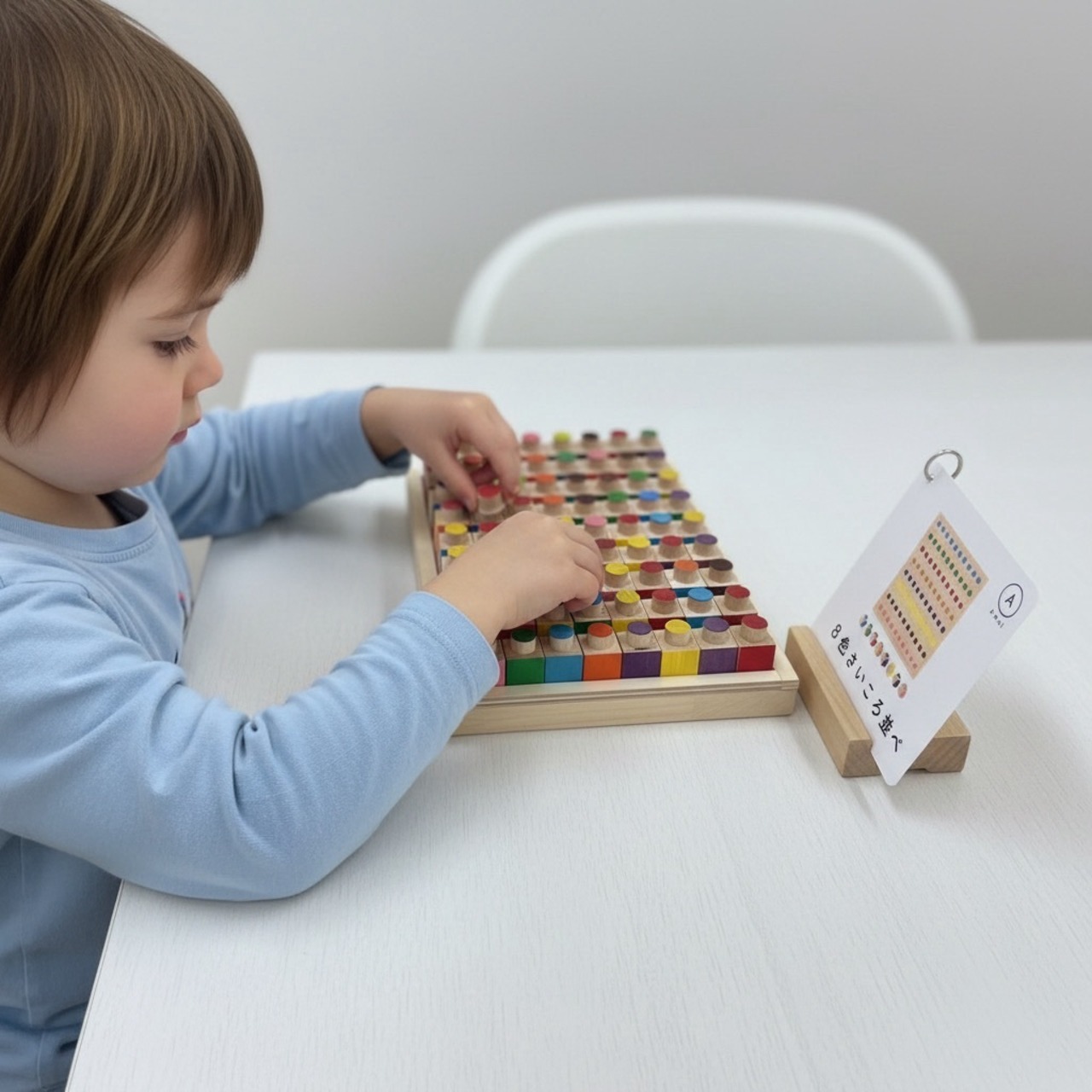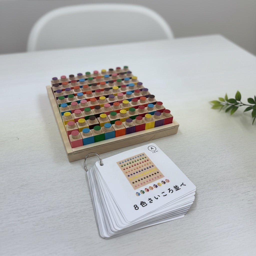 サイコロの色や配置を読み取り、記憶しながら順序よく並べていくことで、空間認知力や記憶力、手先の微細運動の協応を育てることを目的に設計された木製の発達支援教材です。