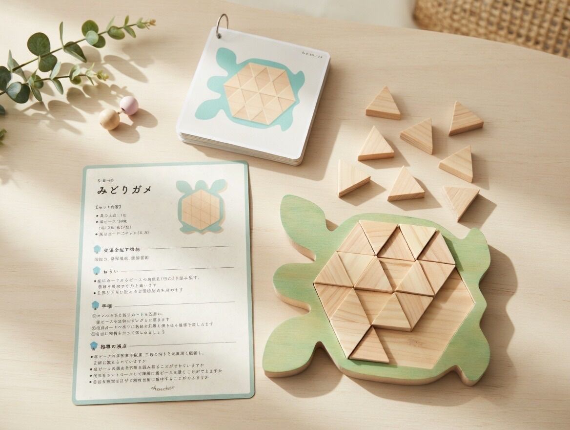 空間認知力や図形構成力、微細運動の協応を育てることを目的とした木製の発達支援教材です。