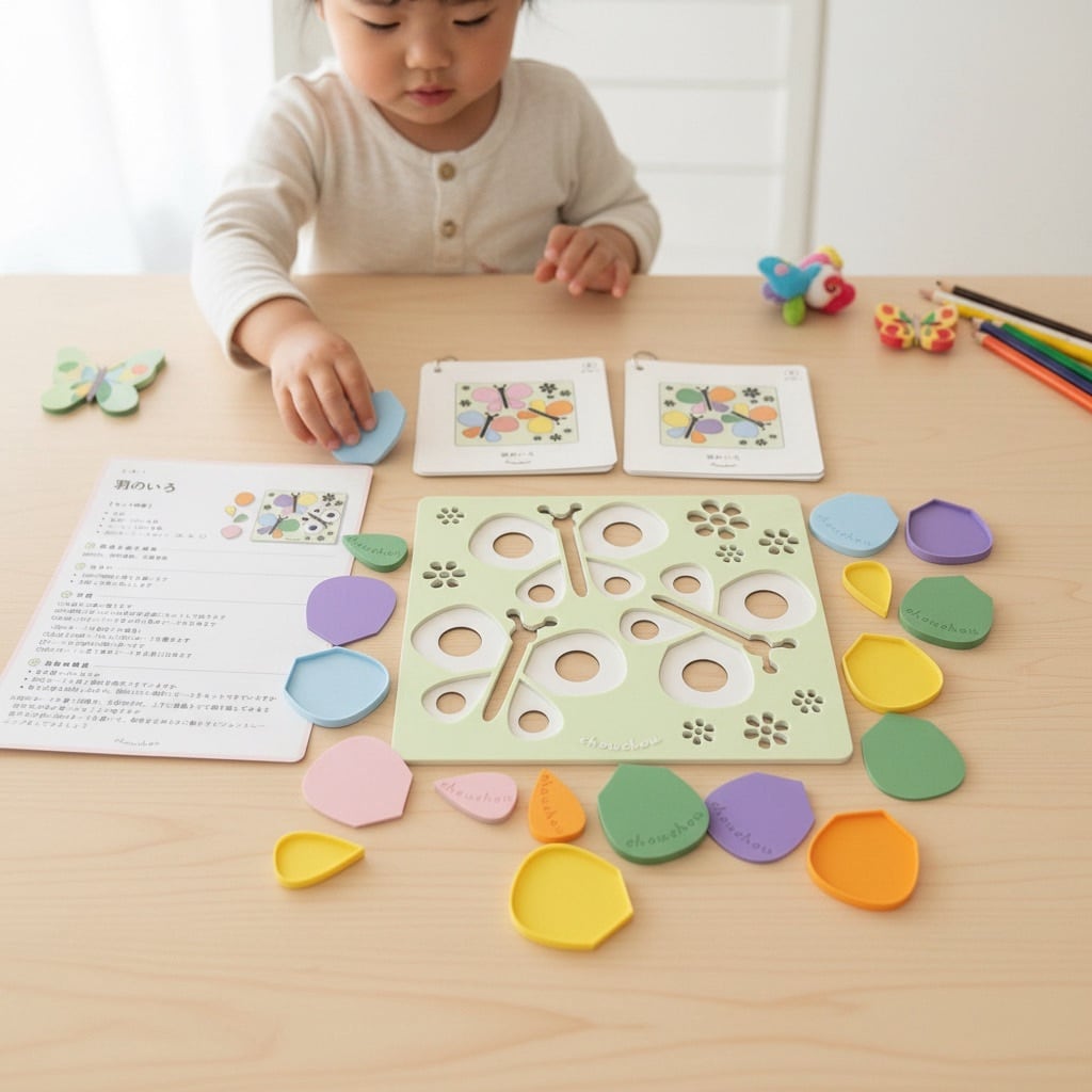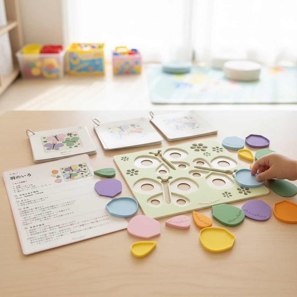 遊びながら、色・形・大きさ・位置の理解と「できた」を大切に育てる発達支援教材。