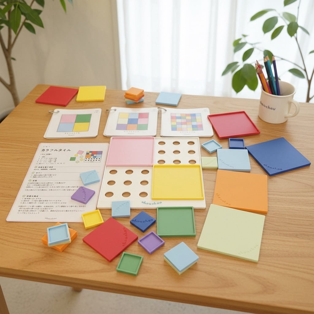 「カラフルタイル」は、遊びの中で考える力と指先の操作性を育てる発達支援教材です。