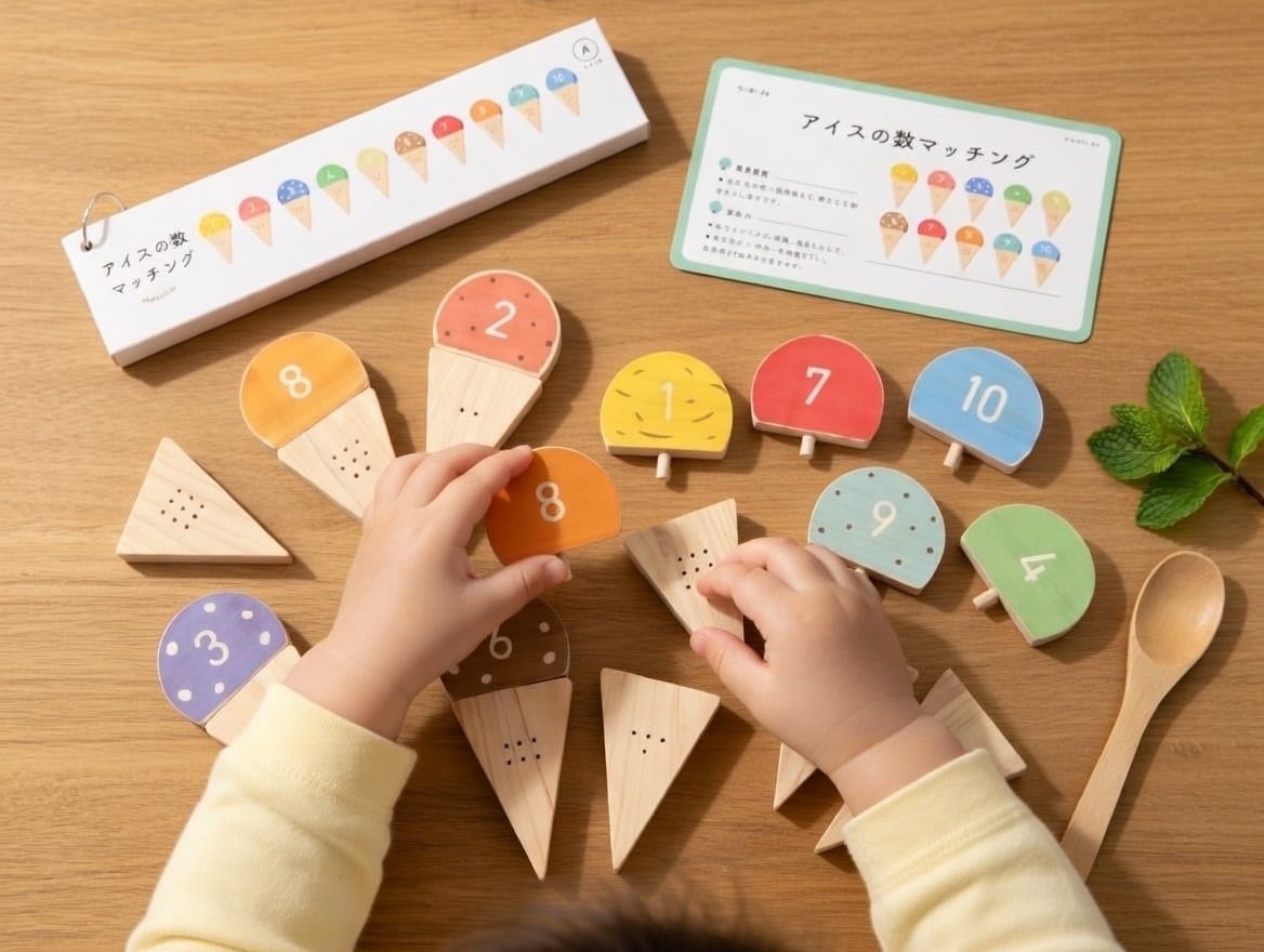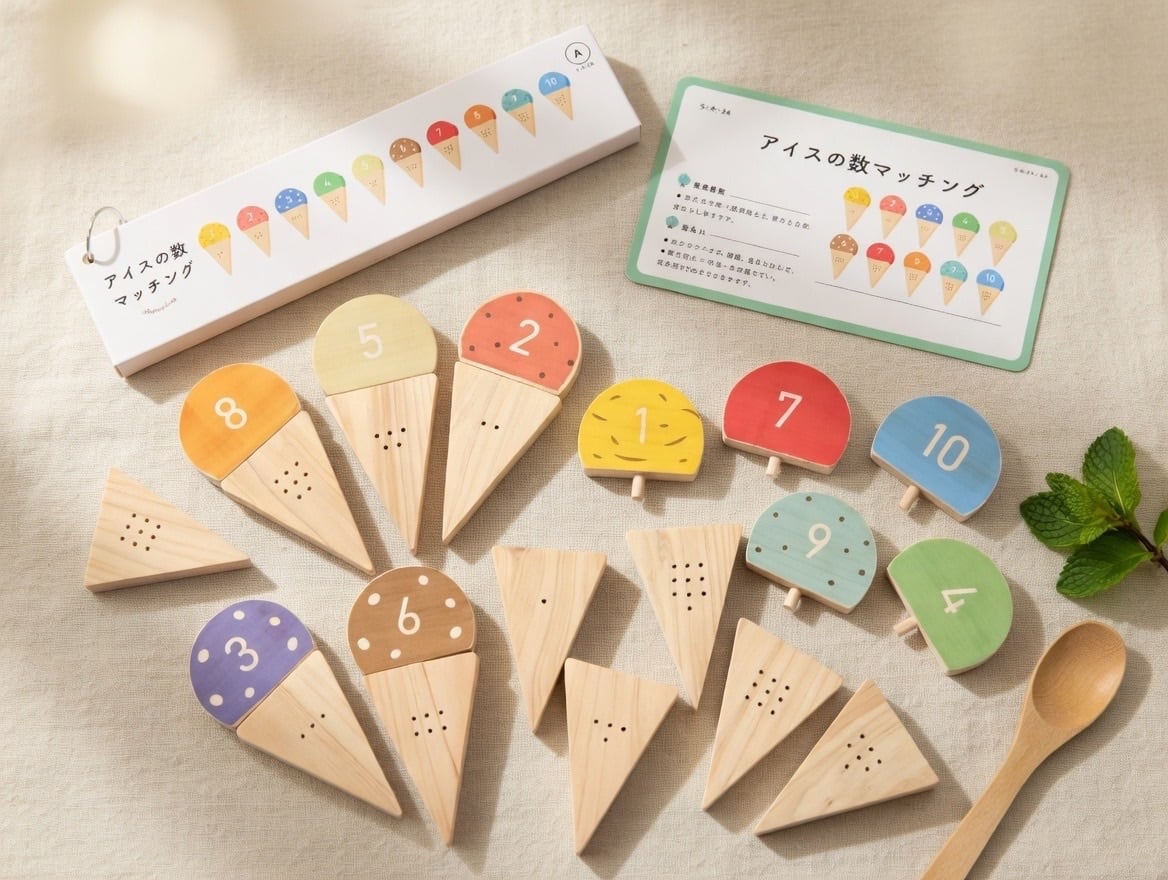 「アイスの数マッチング」は、数字と数の対応に注目しながら数の理解を深めていく木製の発達支援教材です。