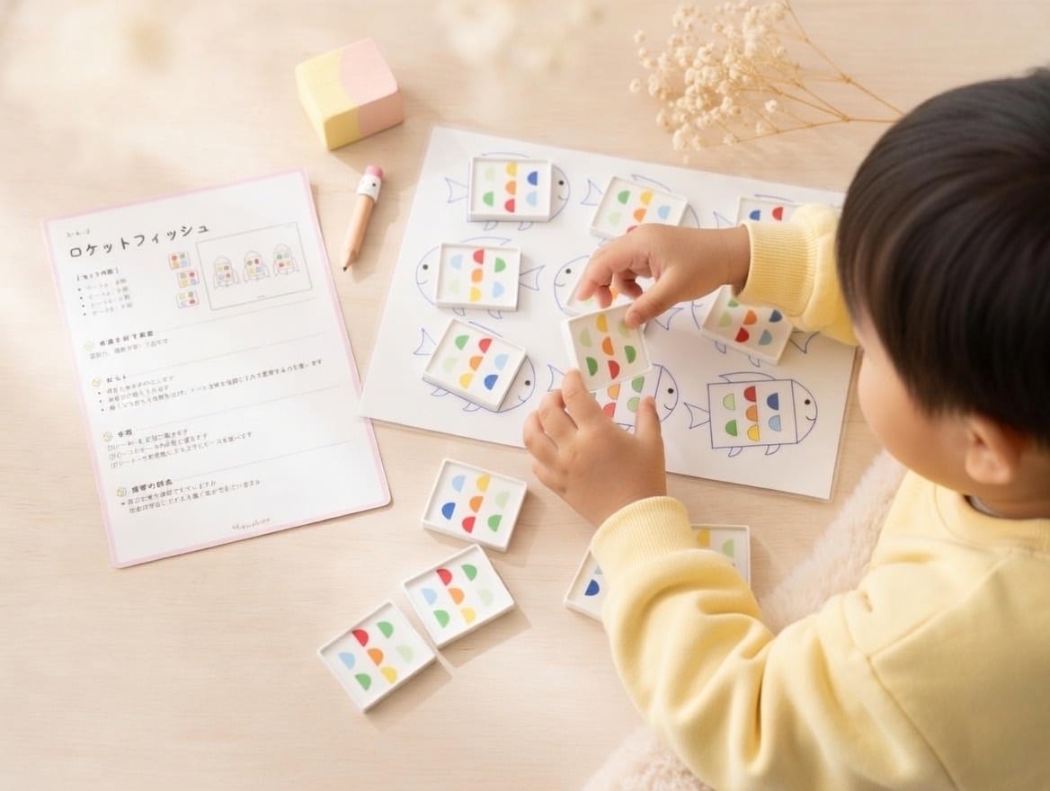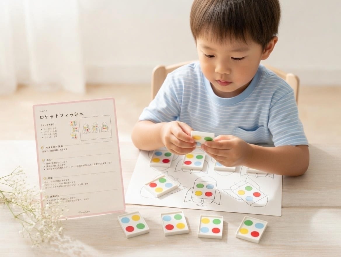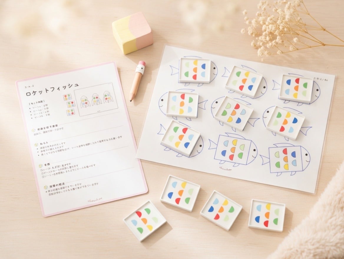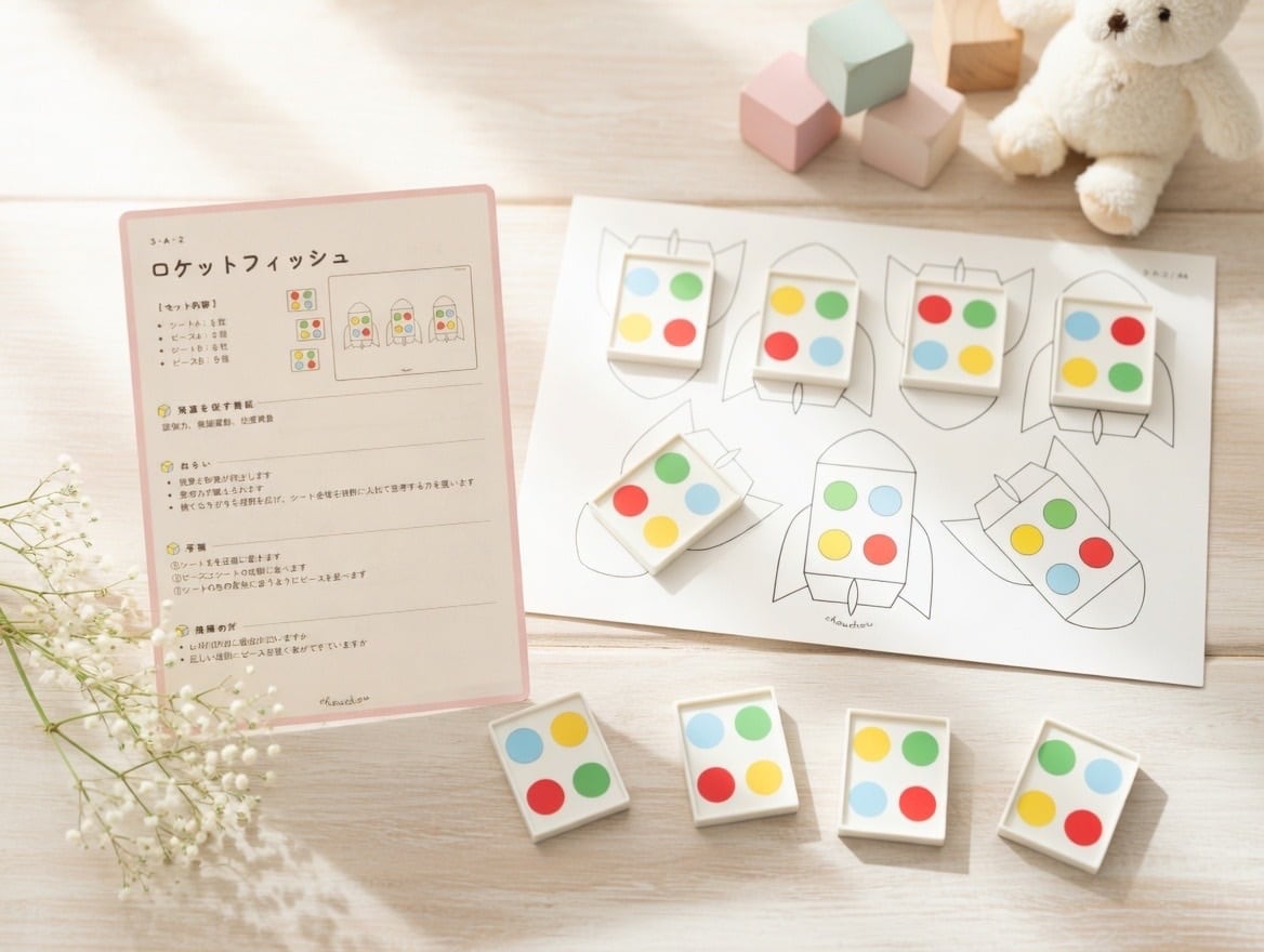 「ロケットフィッシュ」は、シートの配置を見ながら同じ位置にピースを置いていく発達支援教材です。
